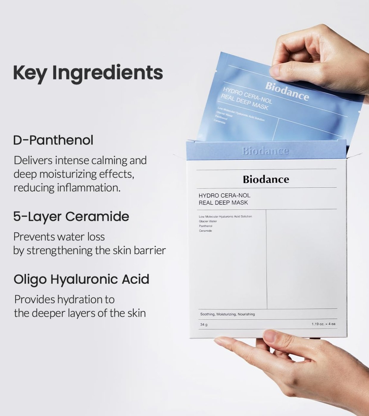 Biodance Hydro Cera-Nol Real Deep veido kaukė – tai premium klasės hidrogelinė lakštinė kaukė, skirta intensyviai drėkinti, raminti ir stiprinti odos apsauginį barjerą. Ši kaukė sukurta taip, kad suteiktų odai giluminę drėgmę ir komfortą net itin sausos ar sudirgusios odos atveju. Inovatyvi hidrogelio tekstūra leidžia veikliosioms medžiagoms efektyviai įsiskverbti į odą, o pati kaukė palaipsniui tampa skaidri, rodydama, kad esencija sėkmingai absorbuojama.