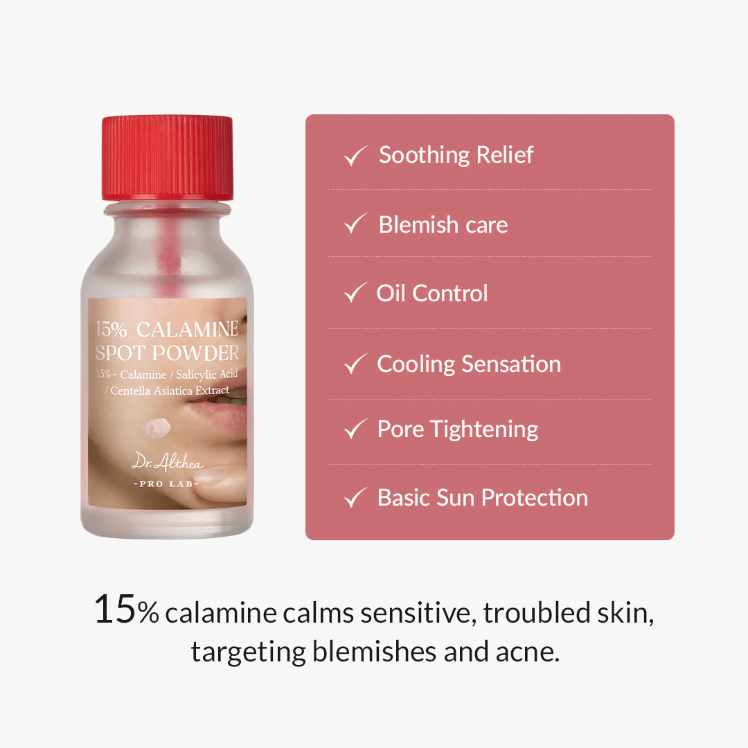 Ši priemonė nuo spuogų Dr. Althea 15% Calamine Spot Powder yra skirta tiksliniam spuogelių gydymui. Ji padeda greitai nuraminti odos bėrimus. Priemonė efektyviai mažina veido raudonį. Tai aukštos kokybės K-Beauty produktas jūsų odos priežiūrai. Speciali formulė kontroliuoja perteklinį sebumo kiekį. Ji padeda išlaikyti odą švarią ir subalansuotą. Priemonė nuo spuogų skatina greitesnį bėrimų gijimą. Jūsų oda atrodys lygesnė jau po pirmos nakties. Daugiau informacijos apie kalamino naudą odai rasite Healthline apžvalgoje.