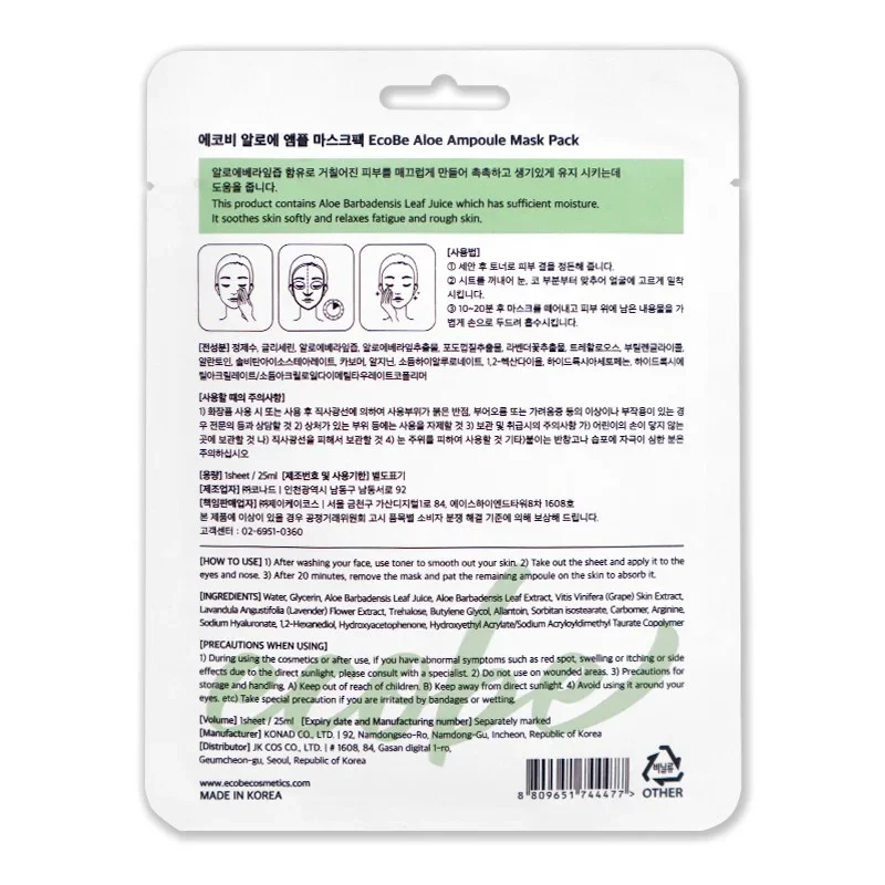 EcoBe prekės ženklas garsėja saugiomis ir švariomis formulėmis. Produktai gaminami Pietų Korėjoje laikantis aukštų standartų. Ši veido kaukė su alaviju atgaivina pavargusią odą. Ji idealiai tinka kelionių metu. Kaukė greitai atstato drėgmės trūkumą po skrydžių. Pakuotėje esančios esencijos užtenka ir kaklo zonai. Jūsų veidas bus dėkingas už šį intensyvų puoselėjimą.
