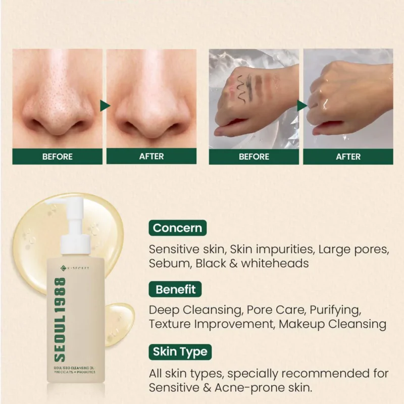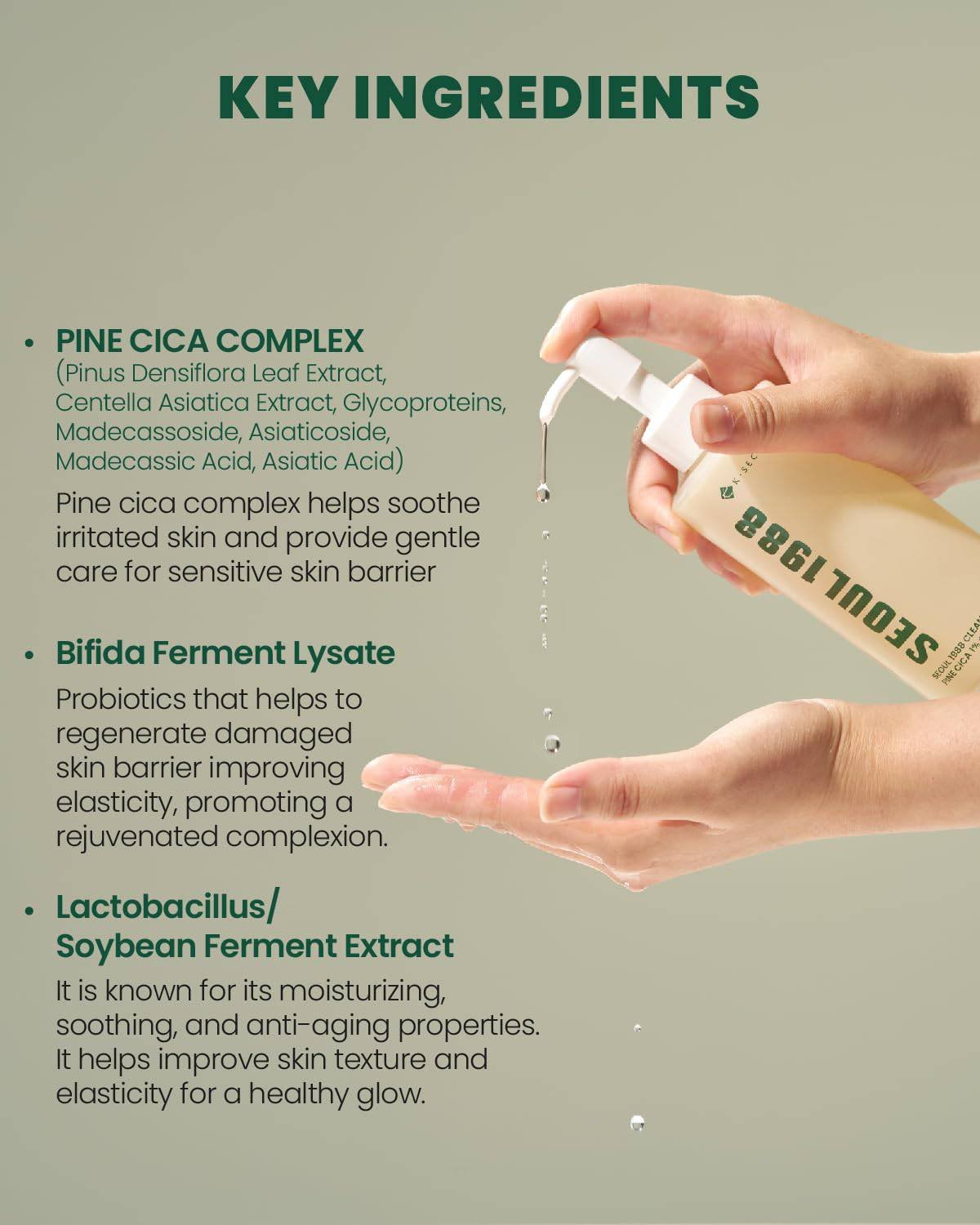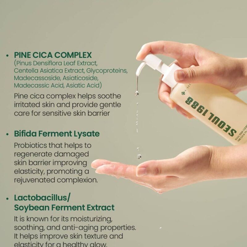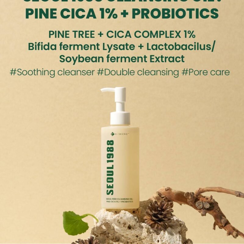 Raminantis drėkinamasis veido valomasis aliejus – puikus sprendimas ieškantiems efektyvaus, tačiau švelnaus pirmojo žingsnio veido valymo. K-SECRET SEOUL 1988 Cleansing Oil Pine Cica 1% + Probiotics užtikrina nuoseklų makiažo, SPF ir nešvarumų pašalinimą be barjero pažeidimo ar tempimo jausmo. Aliejus pagrįstas natūraliais augalinės kilmės aliejais, todėl ne tik švelniai ištirpina kosmetiką, bet ir intensyviai maitina.