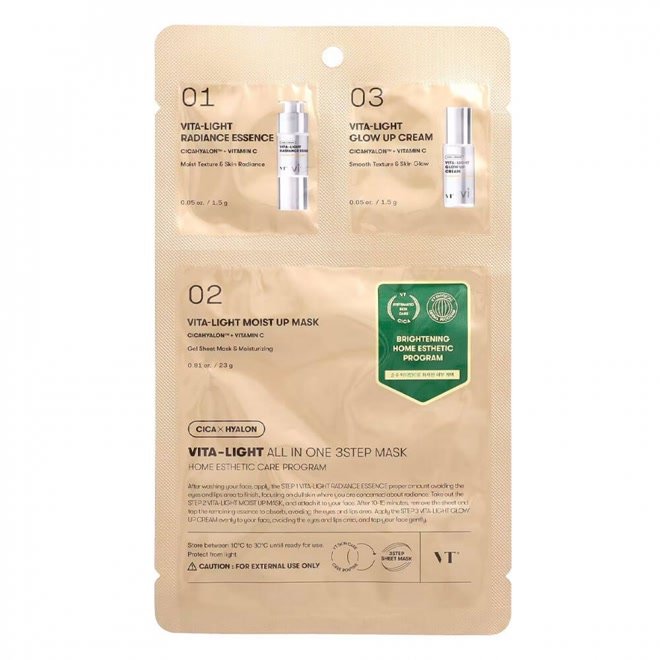 VT Cosmetics Vita-Light All In One 3-Step Mask veido kaukių rinkinys sukurtas intensyviai odos priežiūrai, padedančiai suteikti odai skaistumo, drėgmės ir komforto. Ši trijų žingsnių sistema veikia kaip pilna odos priežiūros rutina vienoje pakuotėje, padedanti pagerinti odos būklę, suteikti jai švytėjimo ir sustiprinti apsauginį barjerą. Produktas sukurtas tam, kad pavargusi, blanki ar netolygaus atspalvio oda atrodytų lygesnė, gaivesnė ir labiau sudrėkinta.
